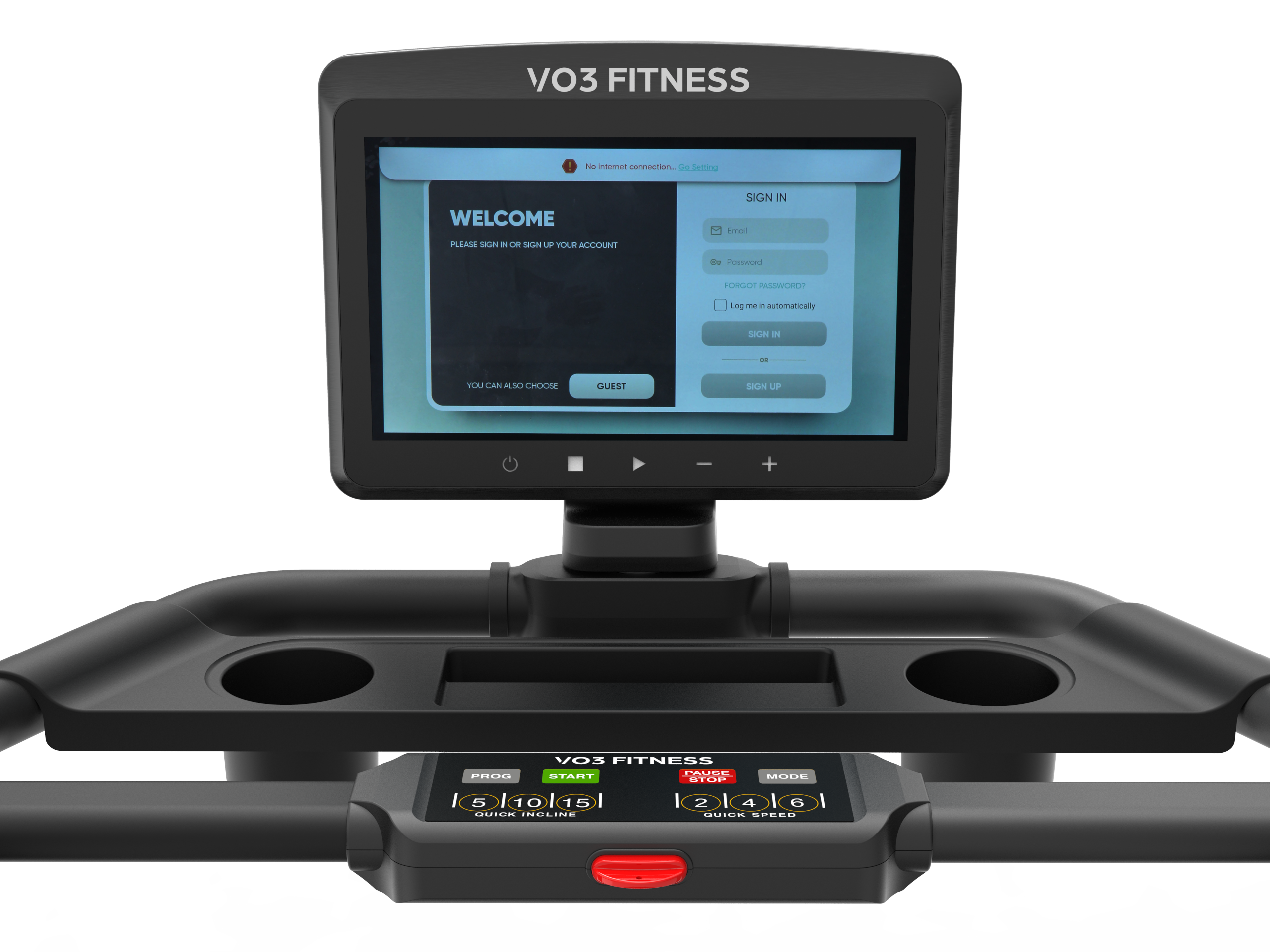 The VO3 T50e Treadmill stands out with its 20"x60" running deck, ideal for running or walking. It features a 15.6" touchscreen console, an easy-fold lift mechanism with quick hydraulic release, and a wide range of built-in programs to keep your workouts varied and engaging. Convenient and versatile, it's designed to enhance your fitness routine.