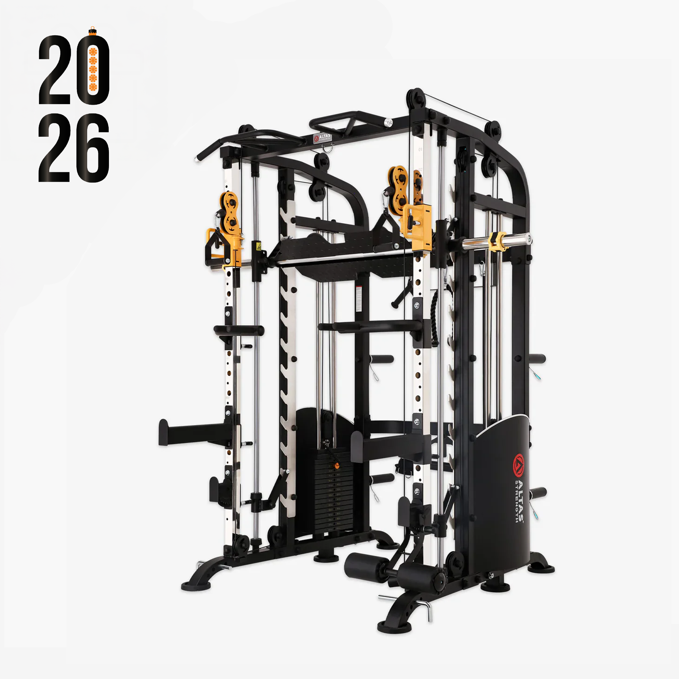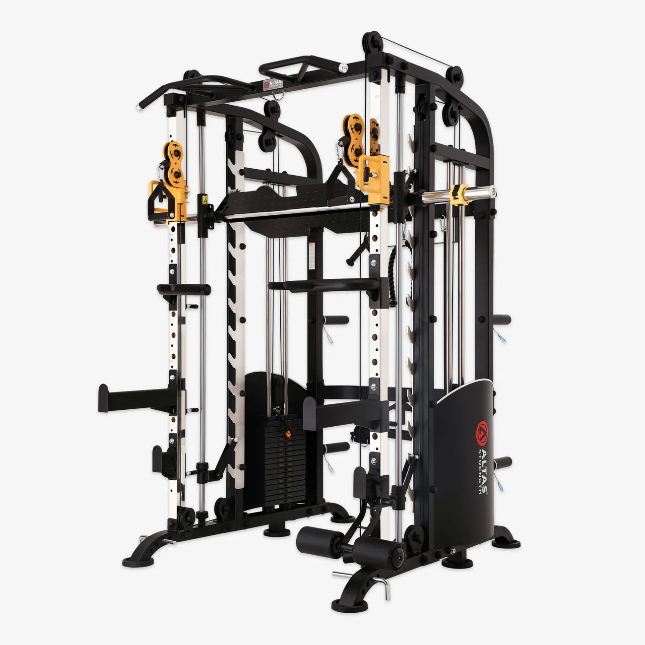 Get a full-body workout with the Altas Strength Smith Machine - a light commercial home gym equipment that includes a total body cage, a 2:1 pulley ratio system, a squat rack, a leg press, and a weight lifting machine, all designed for effective strength training.