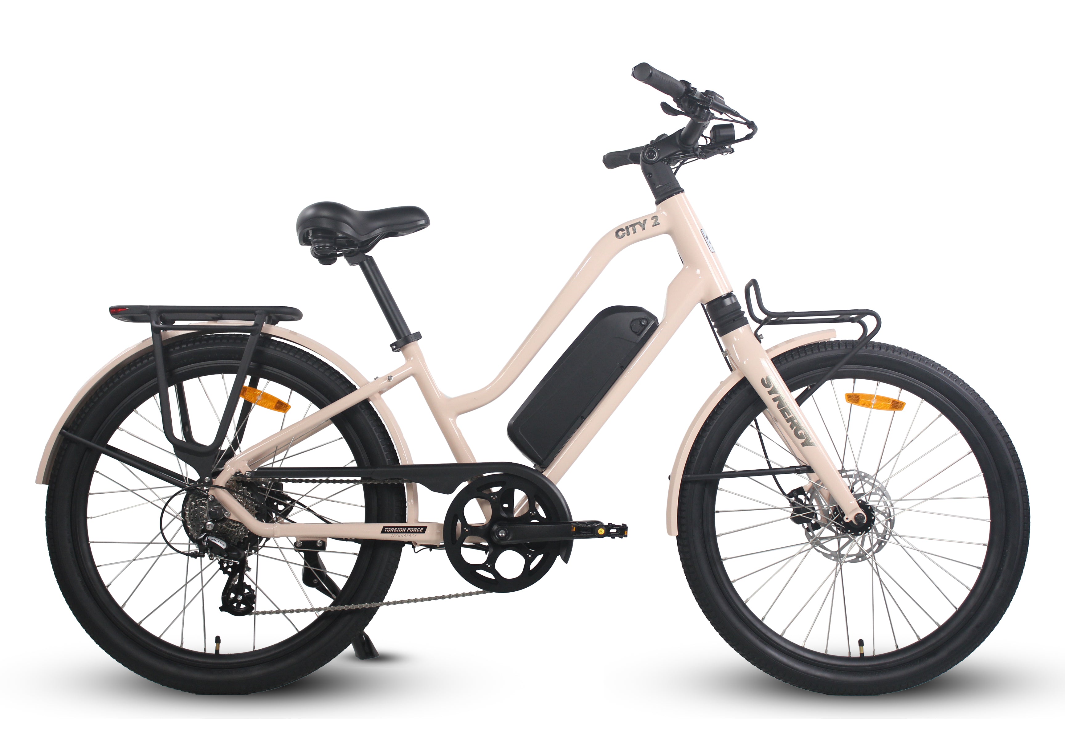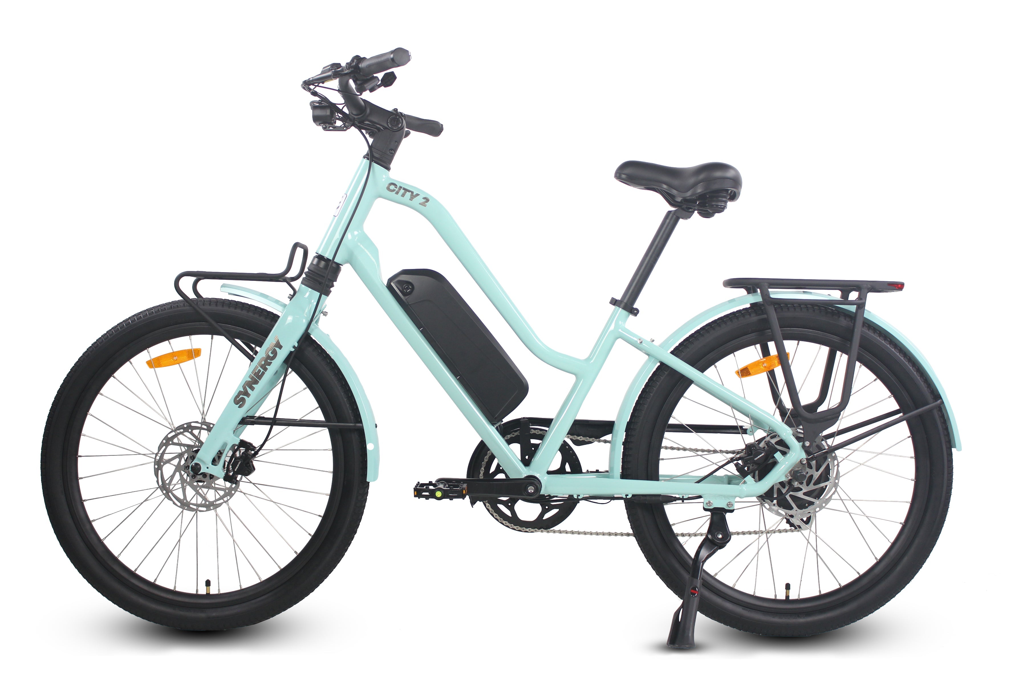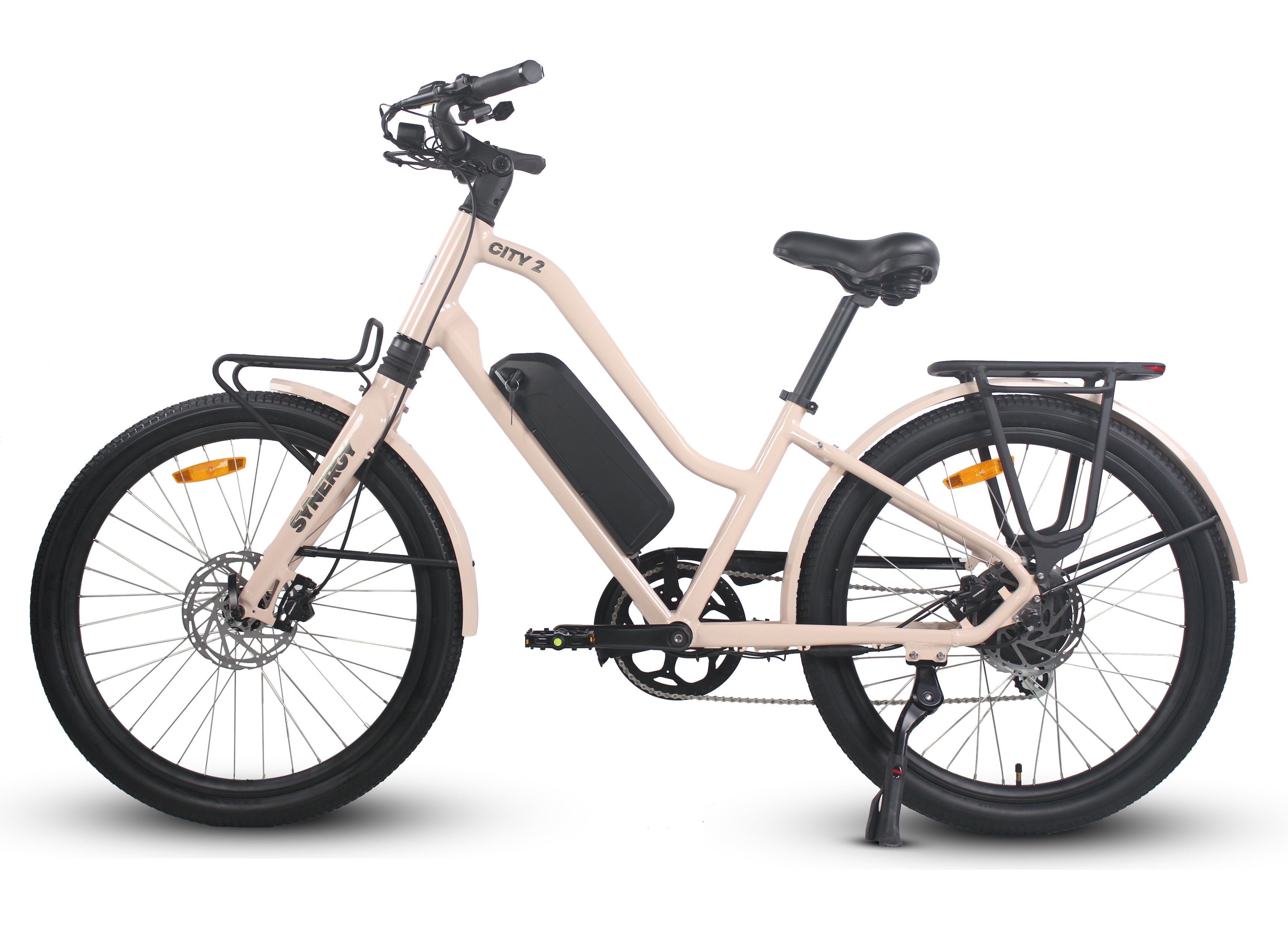 Introducing the Synergy City 2: the eBike that harmoniously blends comfort, style, and seamless transportation. Equipped with comfort handles, storage and front and rear lights as standard features, its thoughtful design ensures both practicality and convenience. Its sleek front display and 26" tires guarantee a smooth ride, whether you're commuting to work or enjoying a leisurely cruise. Powered by a robust 500W motor, the City 2 boasts an impressive range of over 50 km on a single charge, making it the perfect choice for any journey.
