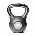 Featuring a chrome handle and rubber coating, each of the VO3 rubber covered kettlebells have a center of mass extended beyond the handle.
