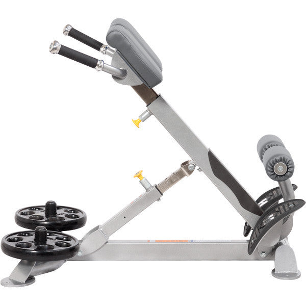 - Contoured foot rests and leg roller pads provide lower body stabilization